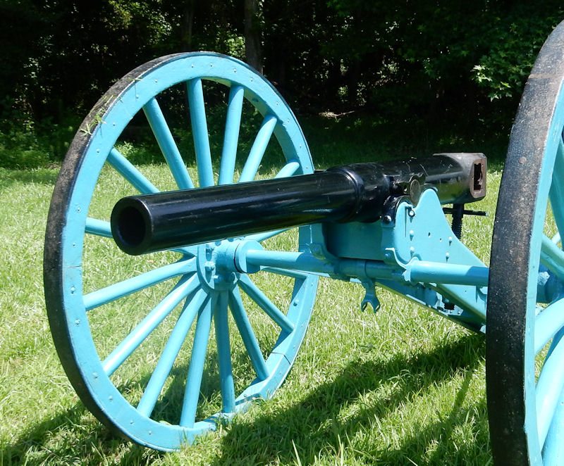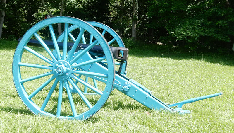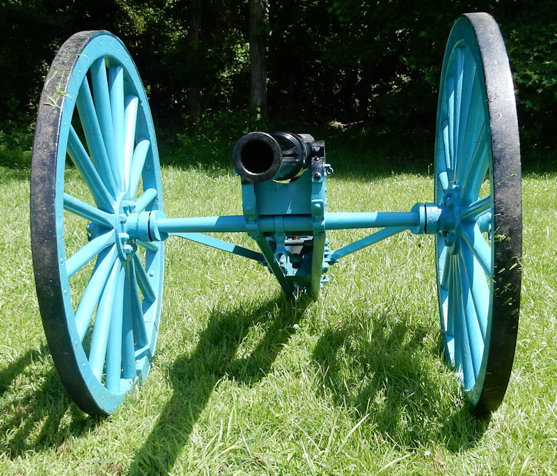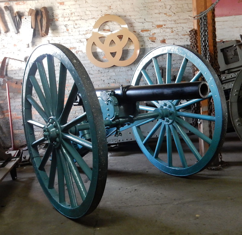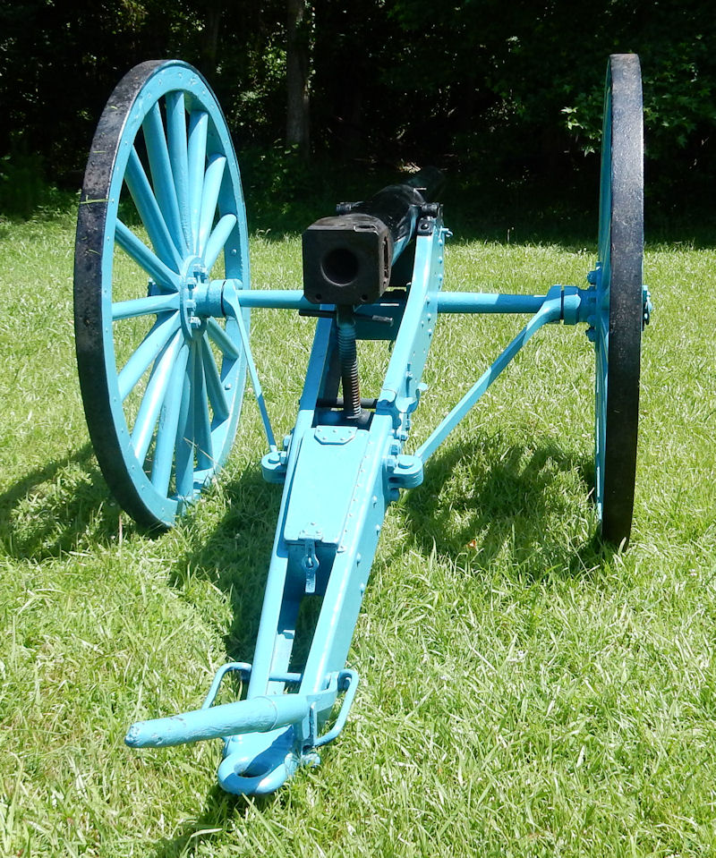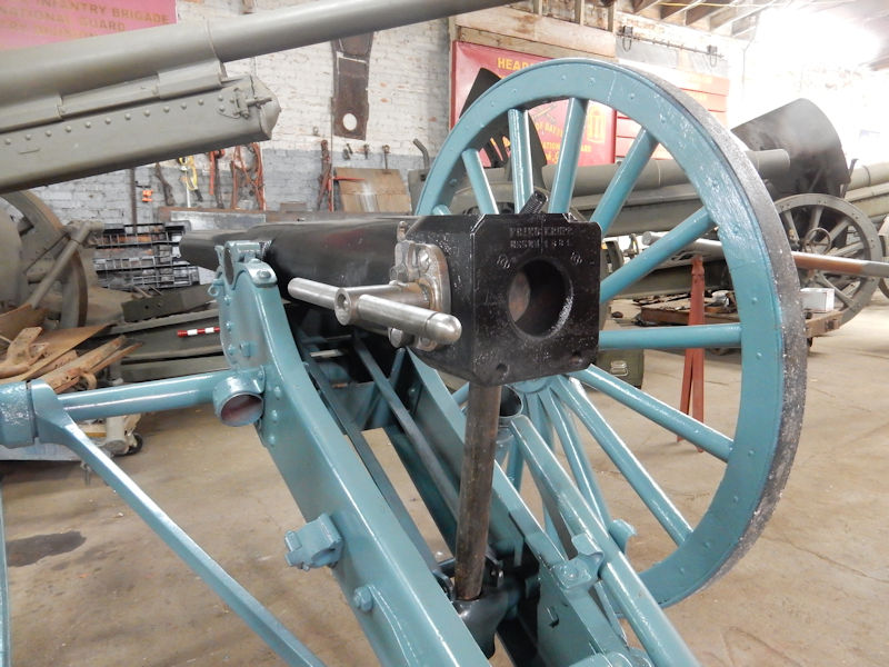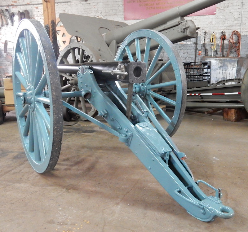 Above: The German Friedrich Krupp manufactured 7,5cm Kanone 1881 export gun. The gun is painted light blue which is typical of Prussian and German field artillery of the pre-WW1 era. This piece has the wrong wheels. The ones pictured here are US 57 inch Archibald Artillery Wheels with the hubs cut to fit the axel length of the 7,5cm. The height of these wheels is also much too high and the number of spokes is not correct