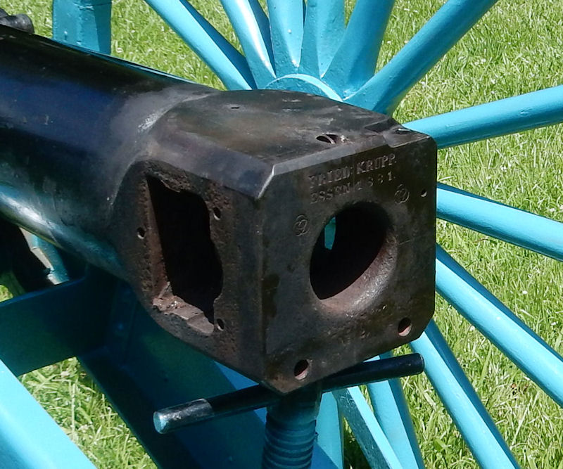 Above: This a close up photo of the breech ring of the German 7,5cm Kanone 1881 export gun. The manufacturer “Fried. Krupp”, date of manufacture “1881”, city of manufacture “Essen”, and the Krupp tri-ring symbols are visible in this photo