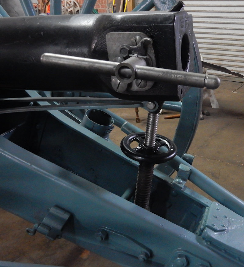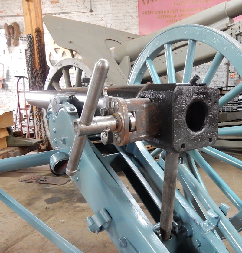 Above: Rear view of the Krupp7,5cm Kanone export gun. The original elevation system was a two step worm gear. There are four guns of this type that I know of in the USA. All are privately owned