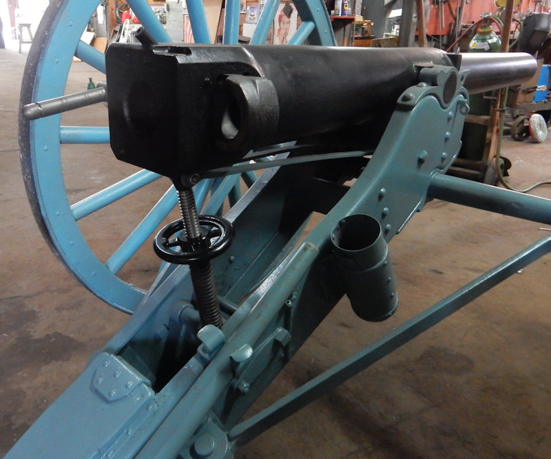 Above: The Krupp manufactured 7,5cm Kanone dated 1881 export gun. This type was not in German service. The breech is now complete and operational. The ammunition ready round mount and the rammer mount are riveted onto the carriage. These parts fit into place without even having to drill new holes. The elevation mechanism is not present in this photo. It is at the machine shop and should be available shortly. The wheels are not the correct German twelve spoke wheels but are instead US sixteen spoke Archibalds. Hopefully, a correct set of wheels will be built in a few months. The color is a typical Pre-WW1 German/Prussian light bluish grey