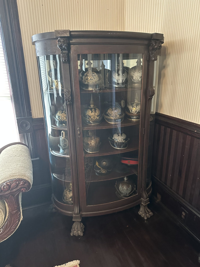 Above and Below: An Empire style couch and an Iranian Tabrizi carpet in one of the front rooms of the E.A. Lovett House. The cabinet is from Roxie Louise Lovett’s home and is circa 1935 . A coal fireplace and mantel can just be seen on the left hand side of the photo. The house has five fireplaces with three chimneys. The electric light fixture was likely added in the 1920s or 30s