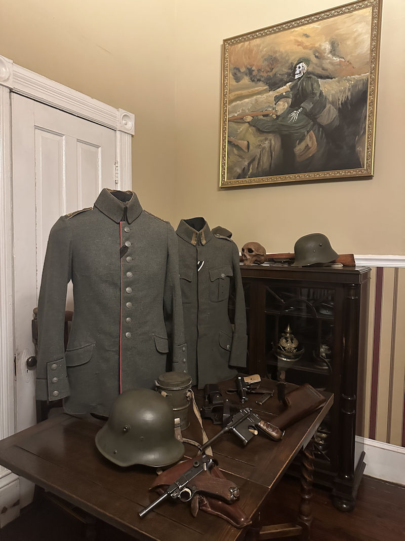 The helmet is a 1916 that I have had for about forty years. It is a BF62 marked one, so F.C. Bellinger, Fulda. Size 62. The uniforms are a 1910 field grey Baden Foot Artillery company grade officer’s tunic and the one further back is a Bavarian Trains Warrant Officer tunic. The weapons are all live and include a red nine broom handle, an 08 Luger, and a 1914 Mauser. The painting in the background is a copy of Hans Larwin’s work. I painted this one