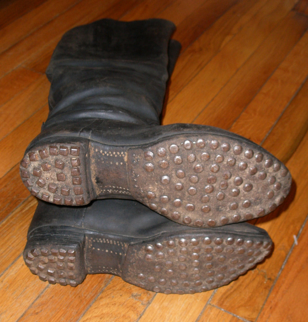 This pair has been fitted with hobnails. Even though this does not seem to be universal, original photographs do show some mounted troops wearing this boot type with hobnails. The Bavarian version of these boots had a leather loop just above the heal to better support the spurs. The pair I have does not have this feature so apparently they are the German/Prussian issue pattern.