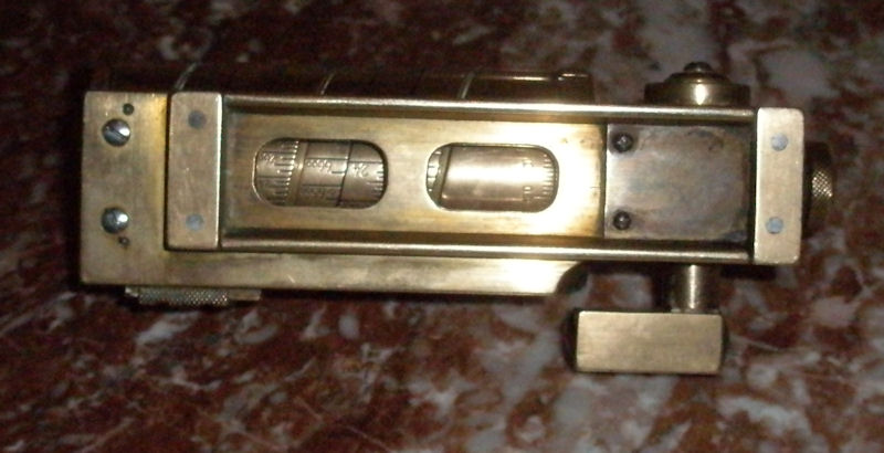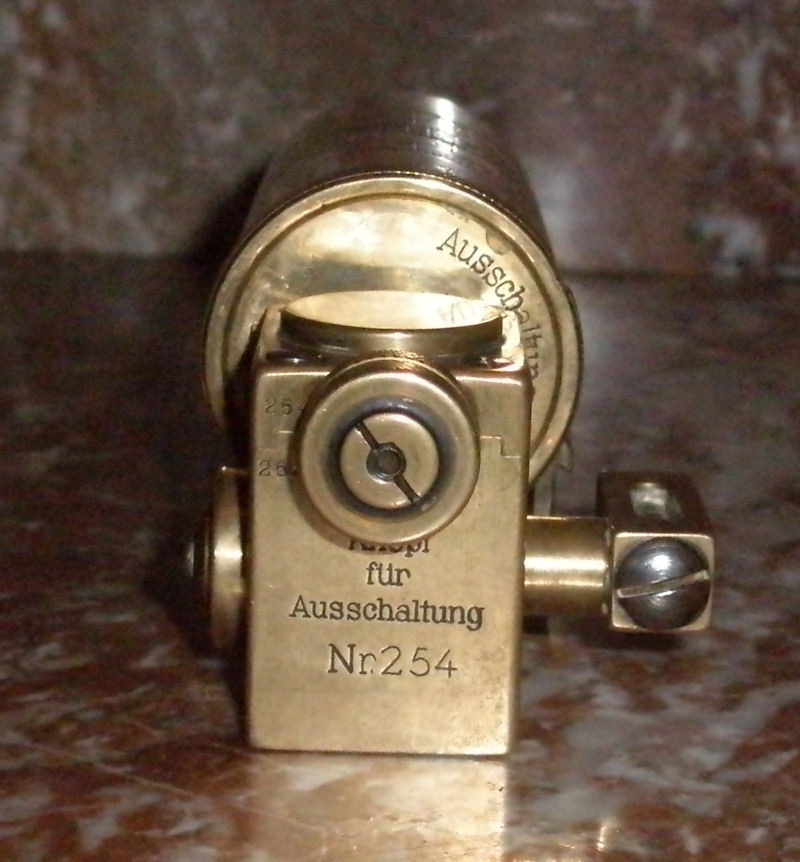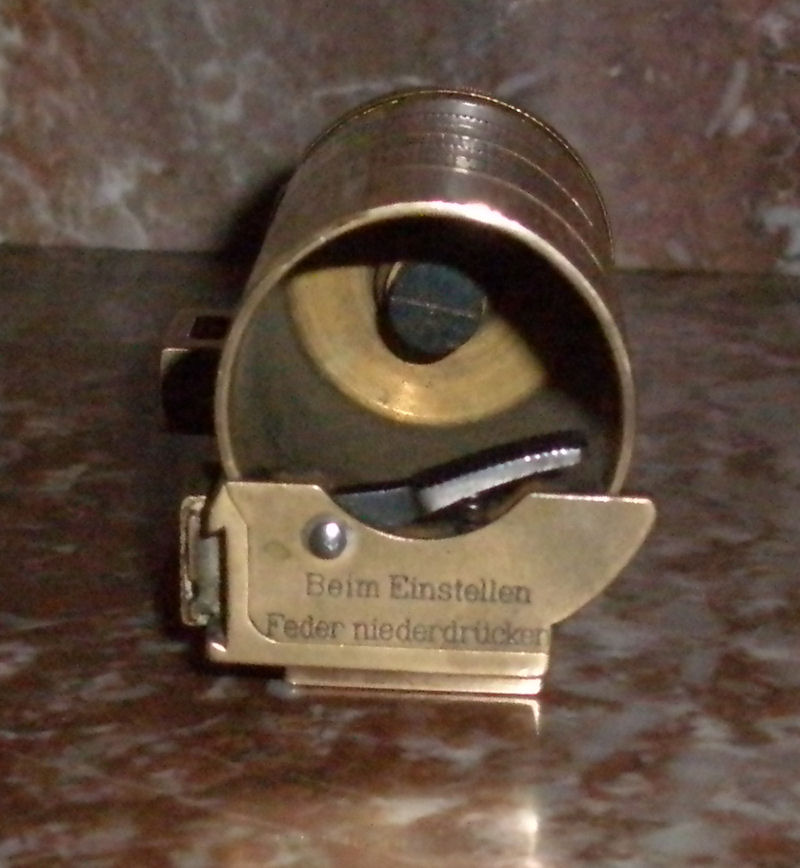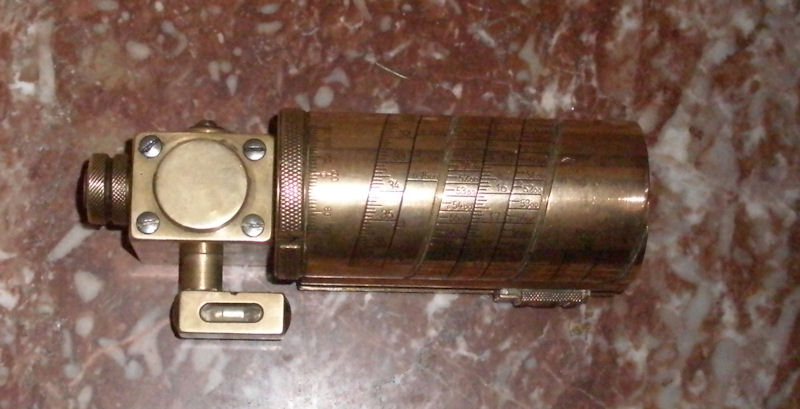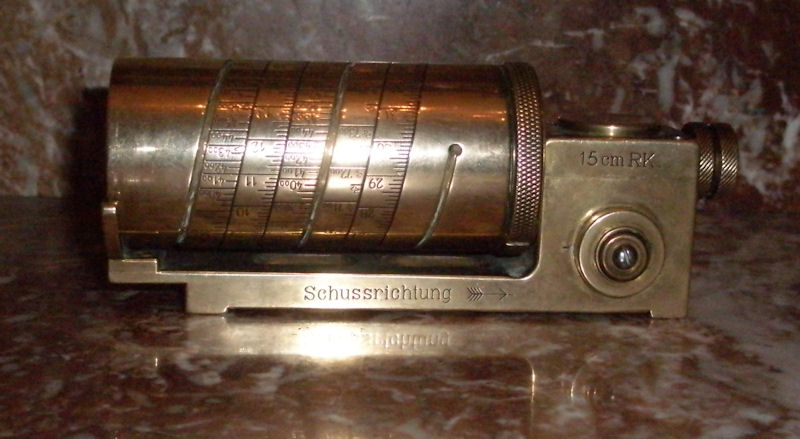 Above: This is a handheld range drum for the 15cm R.K. (Ring Cannon). The distance from the gun to the target is set on the drum and the rectangular shaped piece on the opposite side, with the leveling vile, elevates. Then the gun barrel is elevated to the point that the leveling bubble is centered in the glass vile. The barrel is then at range elevation, so that a projectile fired, with a standard propellant charge, will hit generally at the set range