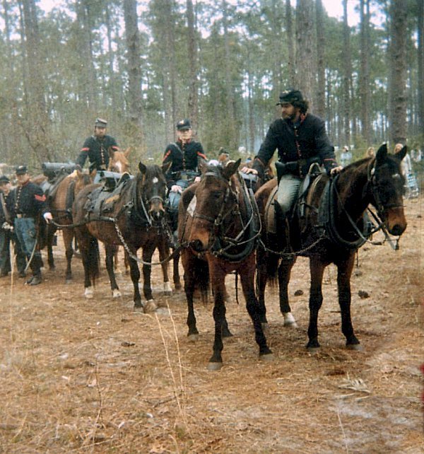 Leon Lovett leading a crew with the 10 pdr. Parrott. Parrott Rifles were produced by West Point Foundry and all were inspected by Robert P. Parrott acting in the dual role of manufacturer and ordnance officer. Production began in May 1861. Many pieces went directly to states. The Parrotts are rifled and fire conical shaped projectiles. They are iron pieces with a distinctive banded breech. This reinforced breech allowed the somewhat brittle iron to withstand the pressure of firing. It also made the Parrott cheep to produce and comparatively light in weight. The 10 pdr. Parrott was the most common but 20, 200 and 300 Pounder Parrotts were also in service. Despite the banding around the breech, Parrott Rifles had a poor reputation because the tube sometimes ruptured while firing. This negative was accepted due the need for large numbers of artillery and the otherwise good performance of the piece. 10 pdr. Parrotts had a maximum range of 2000 yards. This outranged smoothbore field guns of the era by at least 400 yards. Confederate manufacturers also produced their own version of the Parrott. Many Confederate Parrotts were even produced in Macon, Georgia, not far from where the Lovett Collection is located. The 10 pdr. Parrott Rifle is mounted on the standard US Army Number 1 Carriage already in service with the 6 pounder M1841 Gun. It has simple worm screw elevation and the piece is traversed by moving the entire carriage at the trail with a lever. There is no mechanical traversing mechanism. The carriage is primarily made of wood with many iron components. Carriages were generally painted olive drab with iron parts painted black in both Federal and Confederate service. Because individual units made their own paint, variations sometimes occurred even while following the same regulations. This is why some pieces are seen painted a yellowish color. Two sight types were in service with Parrot Rifles. The earliest was the muzzle blade/pendulum hausse sight. These were replaced by a tangent sight mounted to the right hand side of the tube. The Parrott 10 pdr. In the Lovett Collection is a Federal piece produced by West Point in 1862. It is on a reproduction carriage with wheels that are not correct for this piece. The wheels are actually WW1 Era US Army Escort Wagon wheels. Typical six horse team for American Civil War Era Field Artillery provided by 7th Illinois Cavalry in the 1980s. Ralph Lovett is the driver in the center, Leon Lovett stands to the rear of the team. |