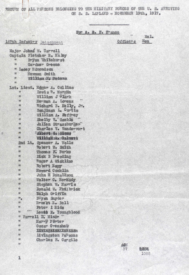 Below: The transport record for 167th Infantry onboard the S.S. Lapland to France, November 19th, 1917. Notice 2nd Lt Donald W. Philbrick’s name 12th from the bottom