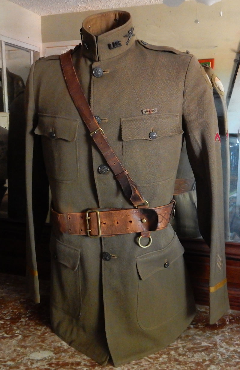 Above: Tunic outfitted with a sam brown belt worn by 1LT Donald W. Philbrick in WW1. His US Great War Victory Medal has five campaign stars, he wears three overseas chevrons on the lower left side along with a red discharge chevron. The insignia on his collar includes Infantry cross rifles with 167th Infantry Regiment numbers. On this tunic he wears the General Headquarters (G.H.Q.) patch from his service after the Armistice. Considering that divisional patches did not see regular use until very late war, he may never have worn the Rainbow Division patch