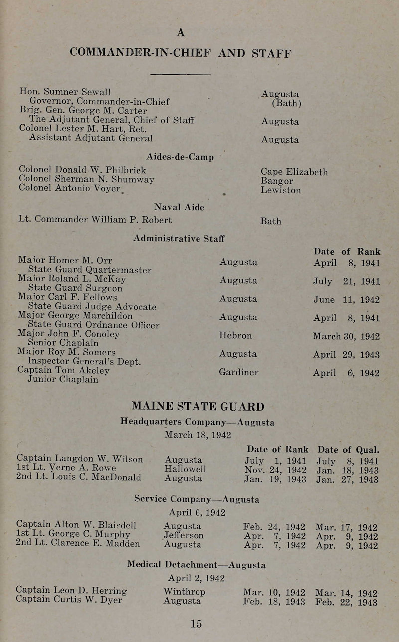 Below: World War Two Era records showing Colonel Donald W. Philbrick serving as the Aide De Camp to the Maine National Guard Commander in Chief