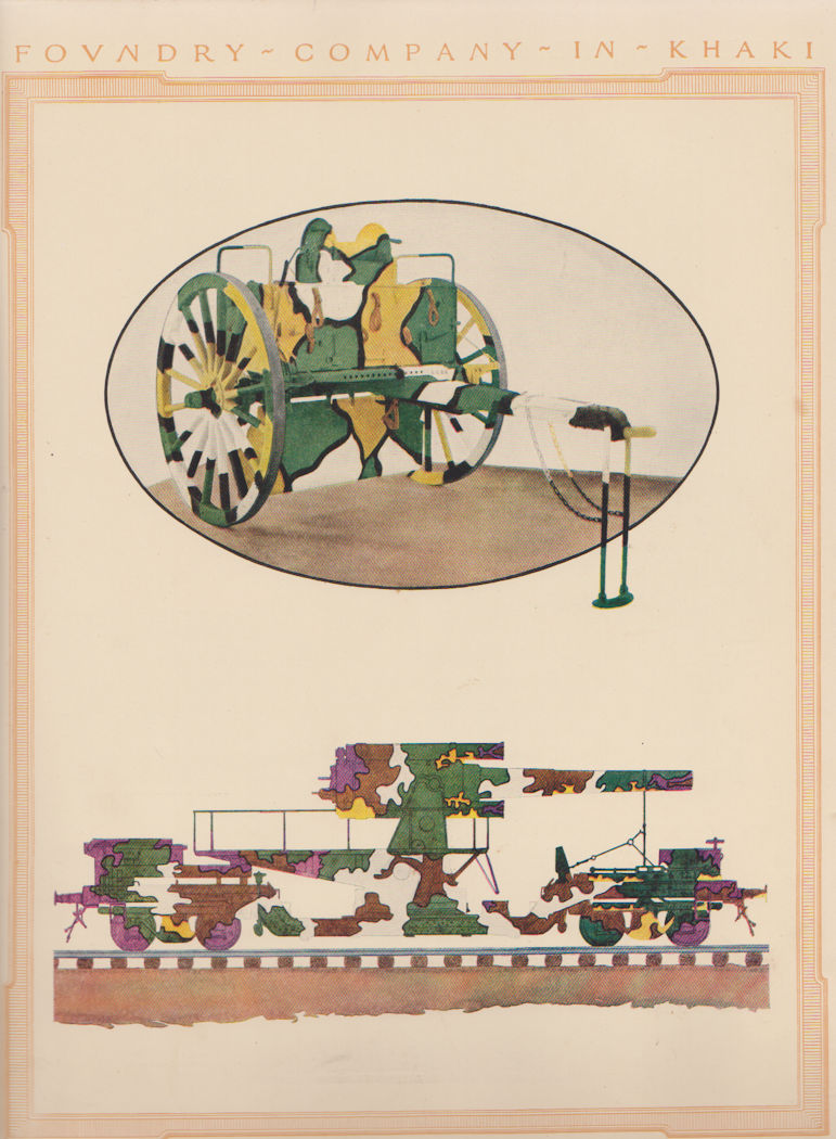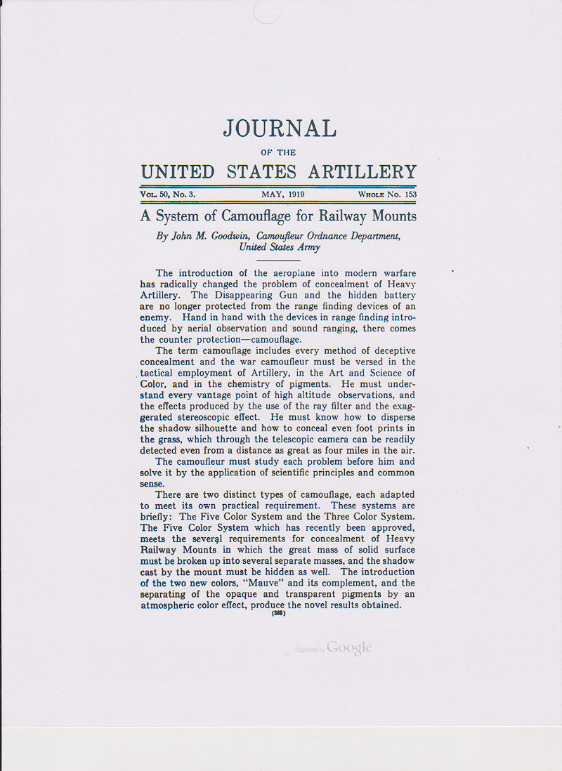 US Army camouflage has been described and illustrated above in the Journal of the US Artillery article, System of Camouflage for Railway Mounts and in the US Ordnance manual Painting Instruction for Camouflaging of Ordnance Vehicles. The painting above was made by Charles E. Burchfield, an artist that was drafted into US Army service in WW1. He is a pioneer of the Cubist art movement in the US. It is unknown if the painting is part of a unit sanctioned guide for applying camouflage or if this was simply his own interpretation. Either way, it shows an interesting variation on the Three Color System. The colors are two shades of green (dark green, and light green), yellow, cream, and two shades of grey (light grey and dark grey) plus black. The grey shades certainly appear to give the illusion of clouds. Neither the Three Color nor the Five Color Systems incorporated this technique. I have been unable to find any period photographs of this system applied to an actual vehicle and it is possible none ever were.