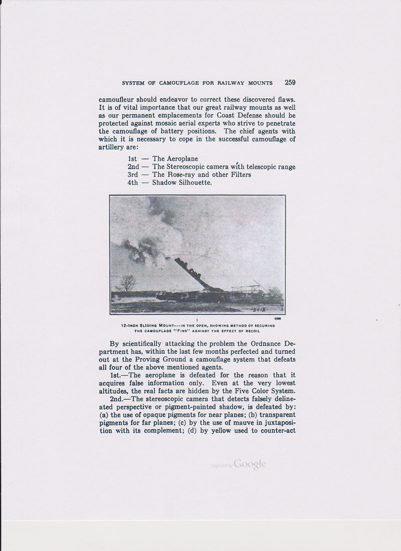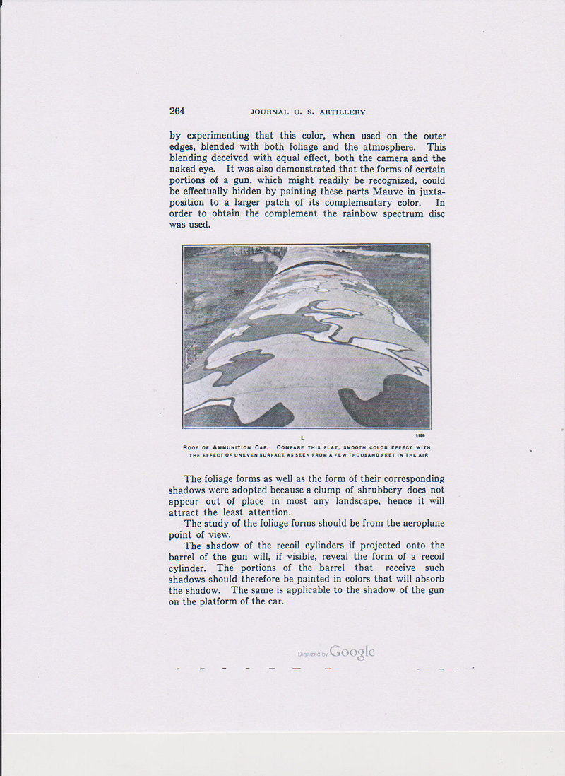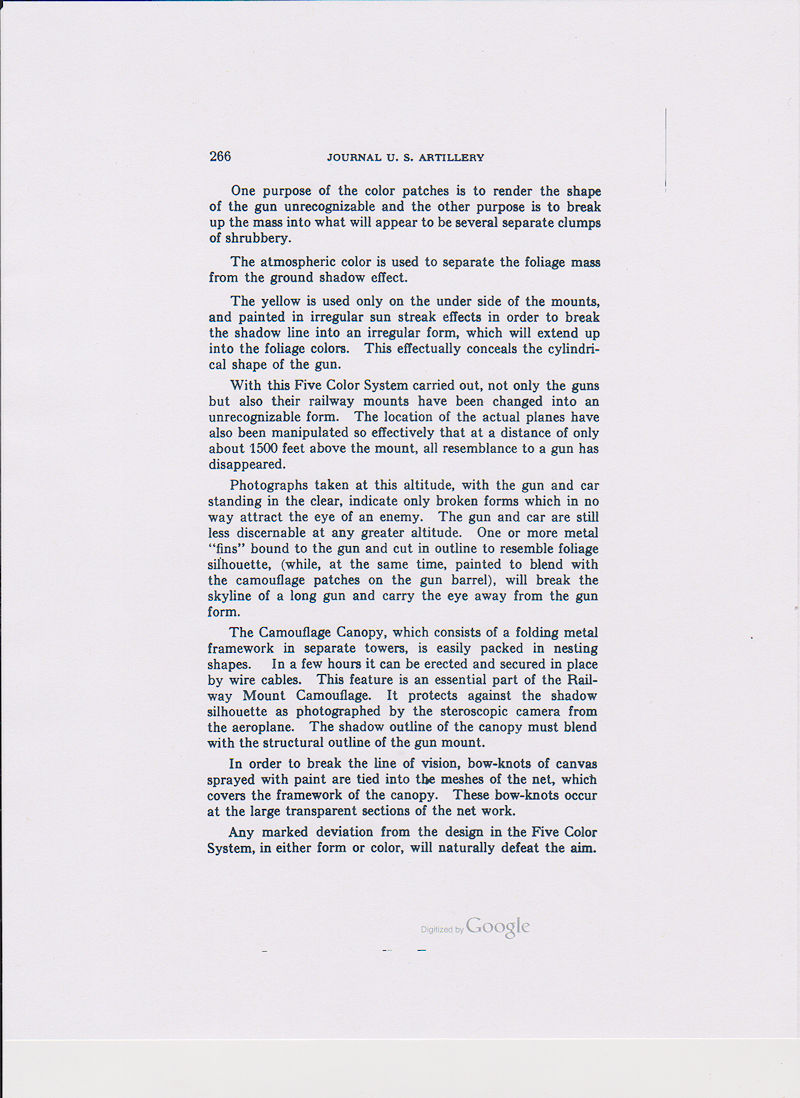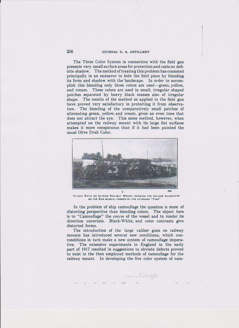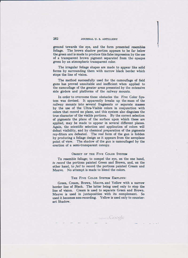 The Three Color System is intended for field artillery camouflage. It consist of the colors green, yellow, and cream with black as a shade to separate the colors. (see page 256 below)