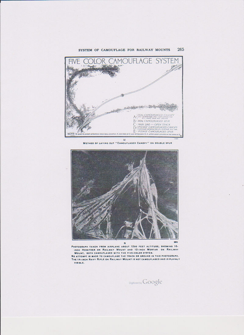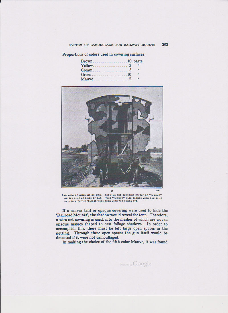 The Five Color System consist of green, yellow, cream, mauve, and its compliment brown, plus black as a shade to separate the colors. This camouflage system is intended for heavy railway mounts such as railway guns but not for field artillery. (see page 253 & 262 below)