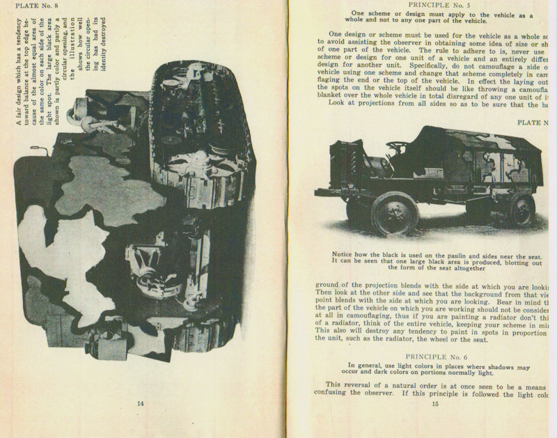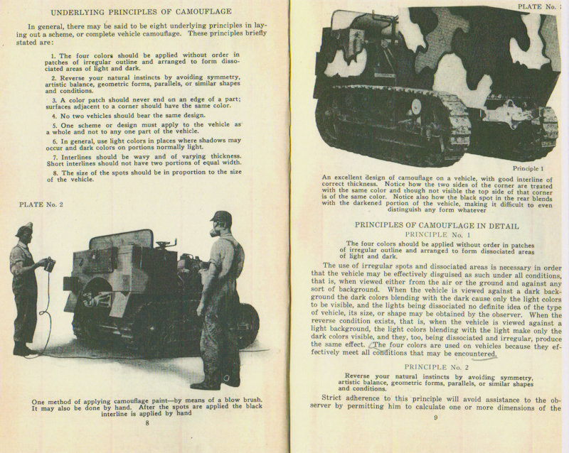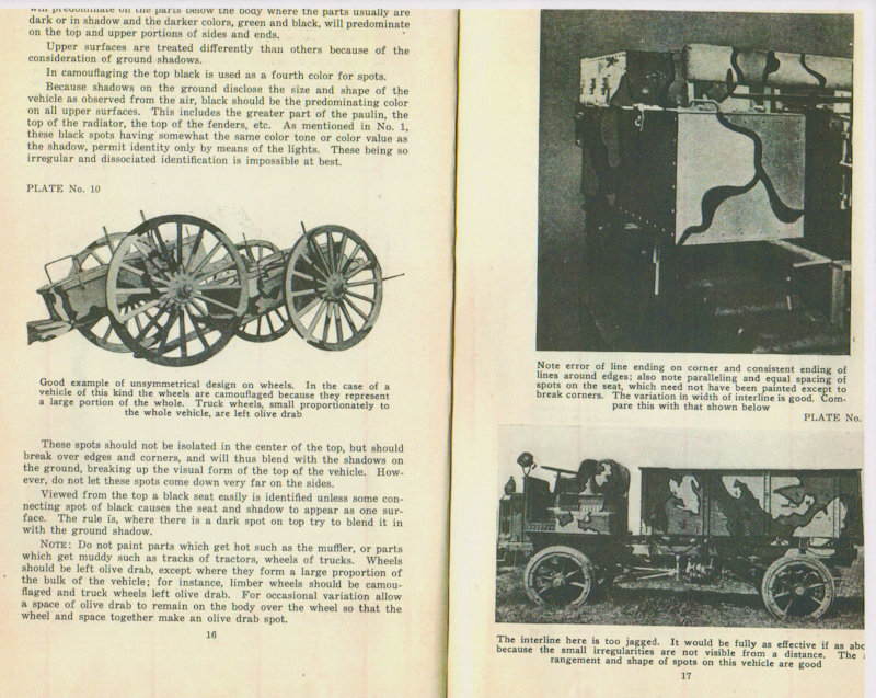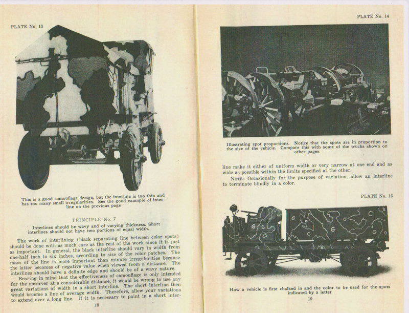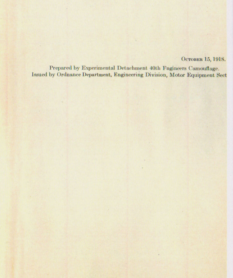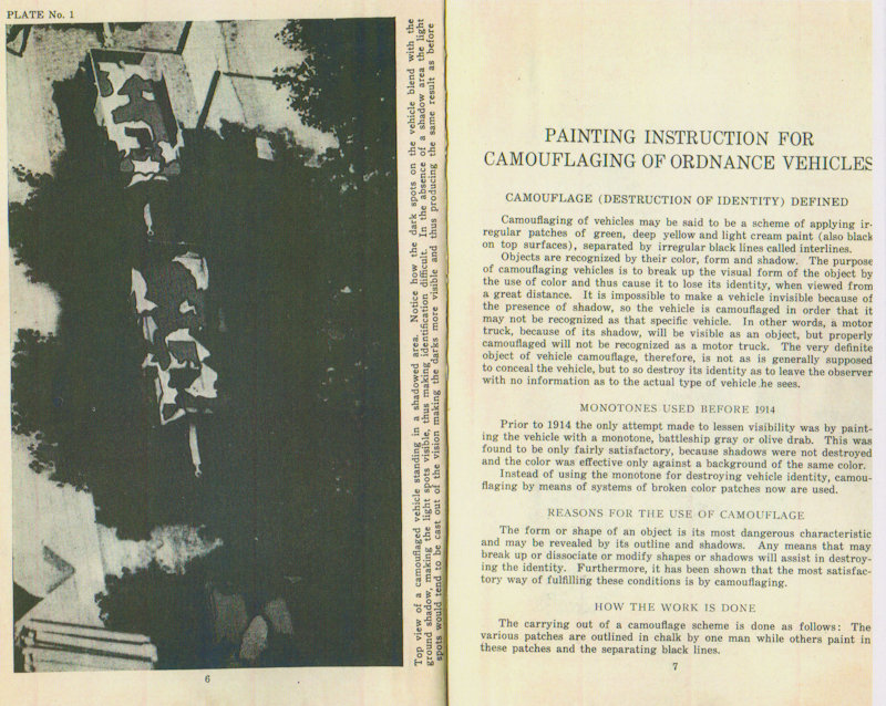 The Painting Instruction for Camouflaging Vehicles below calls out the equipment painted in the same pattern, as was done in the American Car and Foundry factory, as an error. (See page 12 below) However, this is what the equipment actually looked like in service. In the reference below, the Three-Color System is not named but is described. (see page 7) Also notice that the reference below contradicts the Journal of U.S. Artillery article above counting black as a color not as is correctly stated in the article above, as a shade. (See pages 8 & 9) The reference below also makes no mention of the Five Color Camouflage System nor does it discribe it.