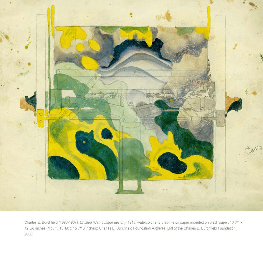 Below: A US M1902 Field Gun's Caisson depicted by painting over pencil sketch. This is a study of camouflage drawn and painted by Charles E. Burchfield while serving at Fort Jackson S.C. in 1918. (Reproduced with permission of the Charles E. Burchfield Foundation)